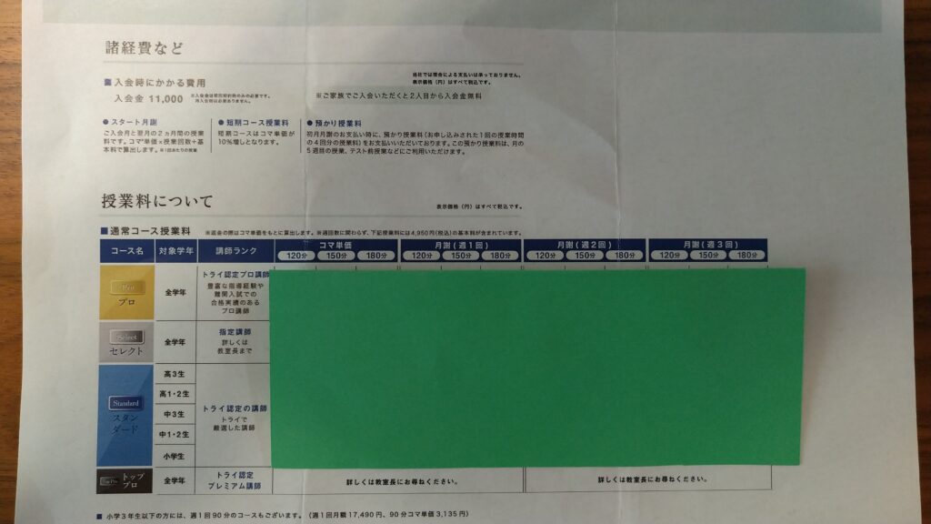 帰宅後すぐにインターネットでトライについて調べ、でもなかなか詳細がつかめないため、ママ友さんに「何か情報プリーズ」と助けを求め、授業料の一覧と直通の電話番号を教えていただきました。