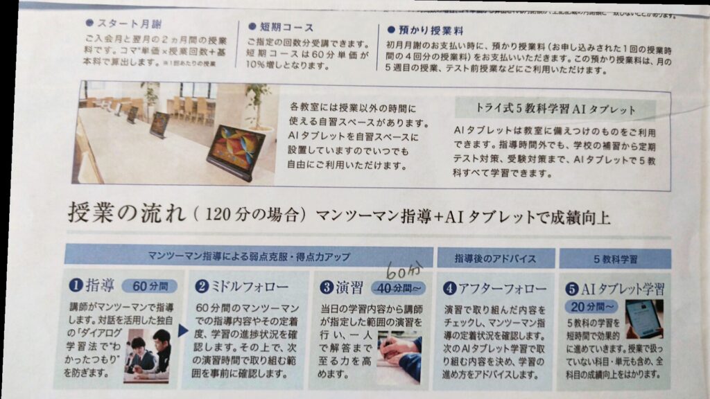 ◼️授業の流れ・・・頂いた資料(上の写真)には「マンツーマン指導+AIタブレット」と記載されていますが、小学生はAIタブレットは使わないと説明を受けました。