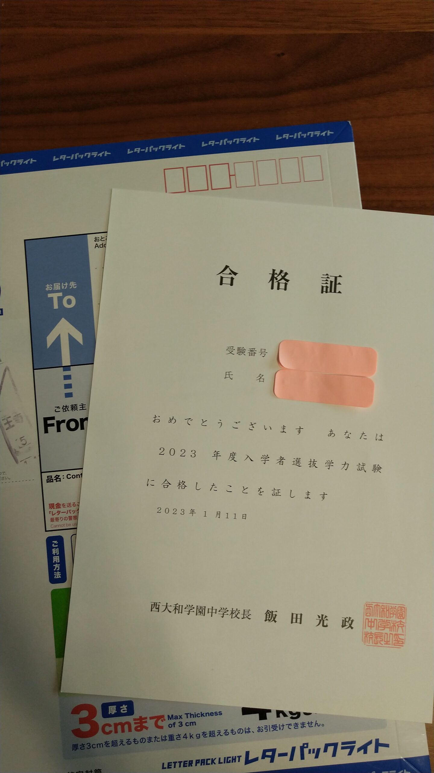 レターパックライトの消印は「1月11日」なっていることから、合格発表と同時に合格証の発送がされたということになります。