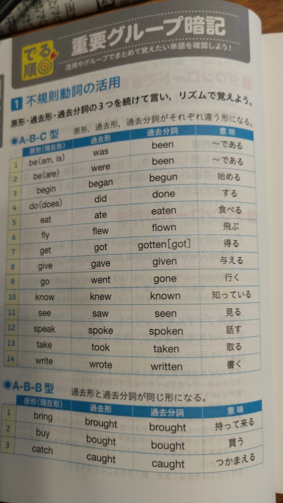 なので以前購入してそのままになっていた「高校入試 出る順ターゲット 中学英単語1800」を引っ張り出し、冒頭にある「不規則動詞の活用」の表の一部をコピーして覚えさせました。